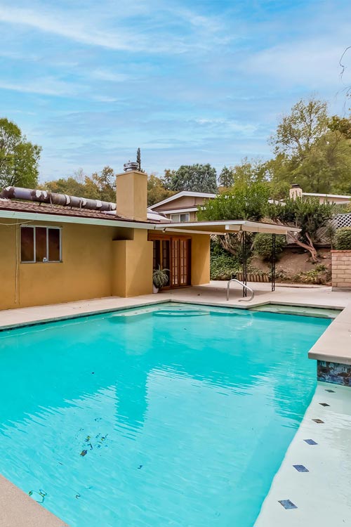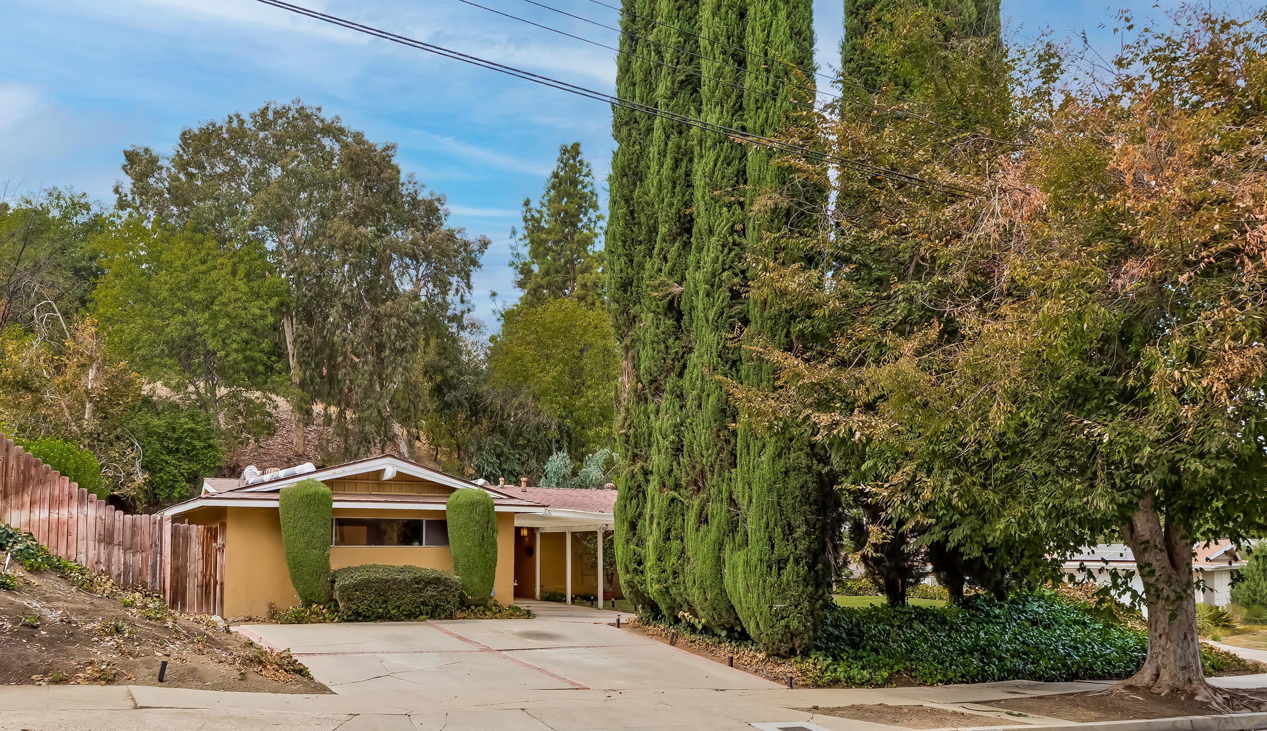 Lovely mid-century, one level family home on almost a third of an acre. This charming home boasts 3 bedrooms and 2 bathrooms with a family room in addition to the spacious living room. There are high ceilings, a beautiful marble fireplace, 2 large skylights and 4 French doors which open onto a newly redone private and inviting pool and spa. The primary suite has a large relaxing spa tub as well as a walk-in closet. The 2 secondary bedrooms share the hall bath. The large family room is perfectly situated off the kitchen. The backyard features a large patio surrounding the pool with plenty of room to lounge in either the sun or the shade. In the front yard, there is an additional private, large and flat, grassy area perfect for a swing-set or even throwing your dog a frisbee! Excellent opportunity to add your own touches. This home has been in the same family since it was built in 1959! A great Woodland Hills location in the serene, quiet neighborhood of Carlton Terrace, but also near shopping, dining, outdoor recreation, and freeway!